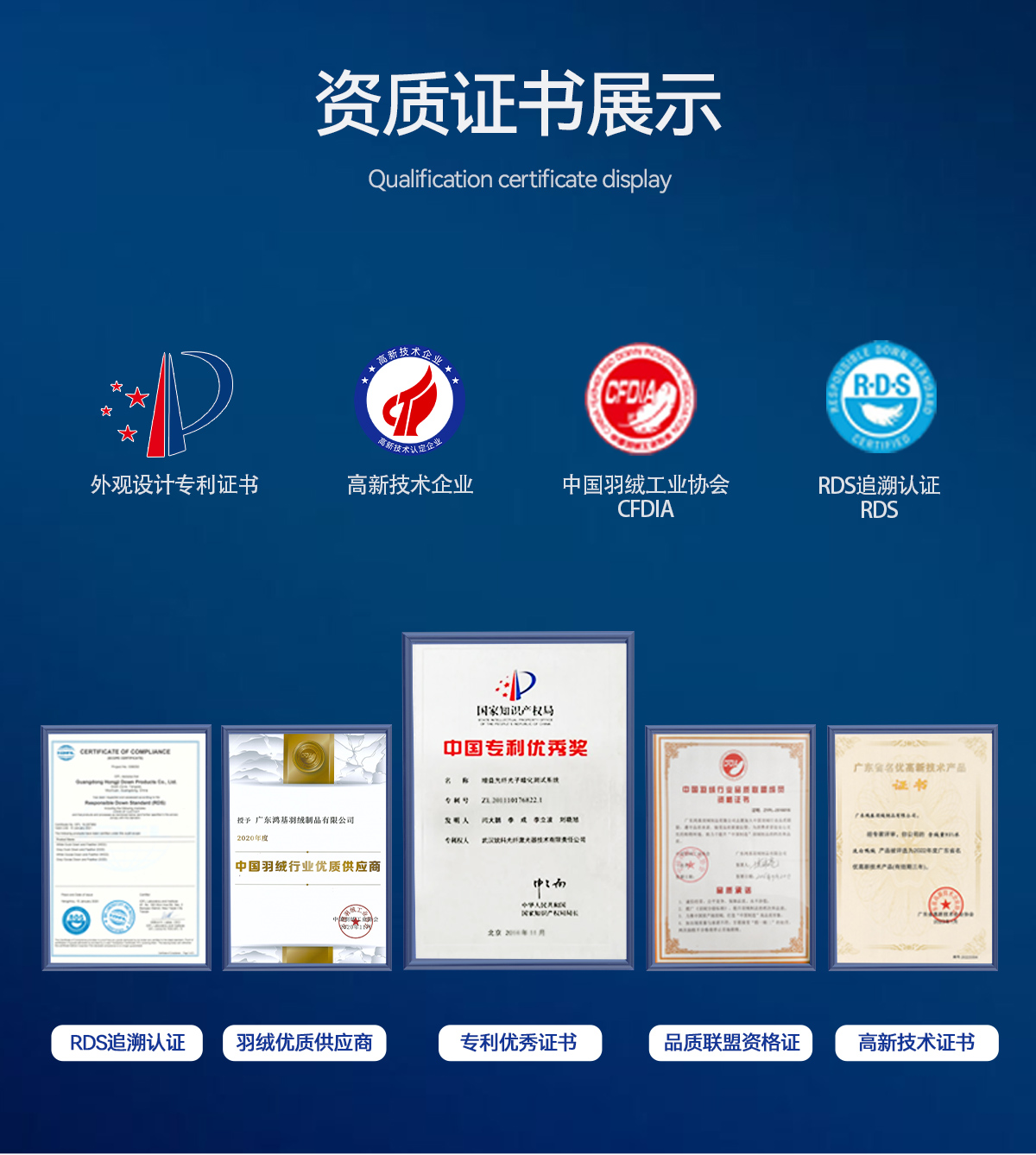 《一(yī)種提高(gāo)水(shuǐ)洗羽絨清潔度及蓬松度的(de)裝置及其>•↓π方法》 2017年(nián)榮獲中國(guó)專利優秀獎。《羽絨粉塵測試儀》 2₹ 019年(nián)獲得(de)國(guó)家(jiā)專利認證,可(kě)快(kuài)速♦♣ 檢測劣質羽絨中的(de)粉塵含量。還(hái)有(yǒu)多(duō↔σ→δ)項羽絨生(shēng)産設備與加工(gōng)技(jì)術(shù)的(de)¥✔創新專利。